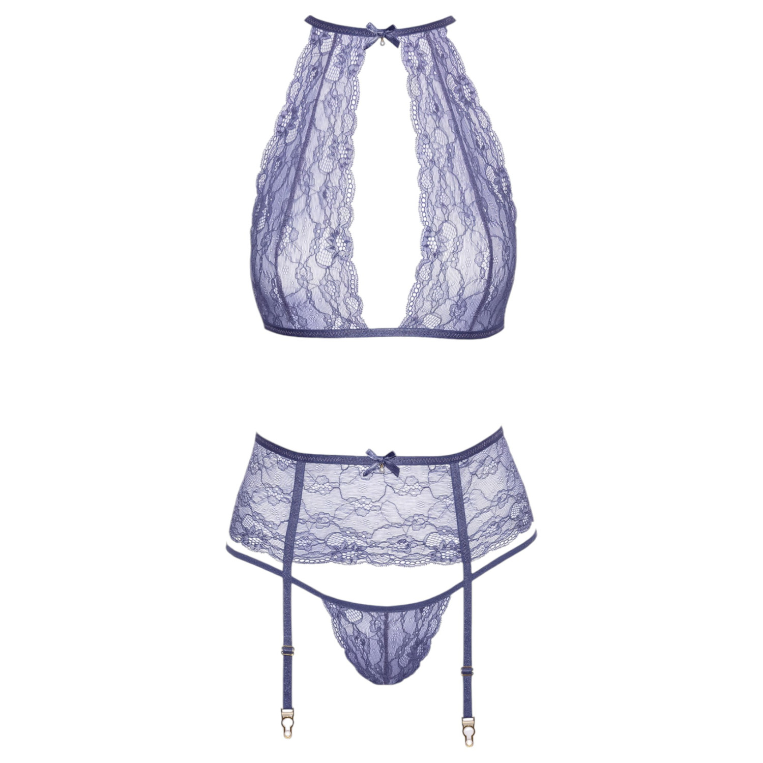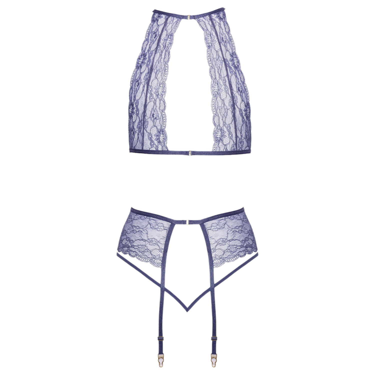 Det här vackra setet i genomskinlig spets ger dig en elegant och sensuell look.