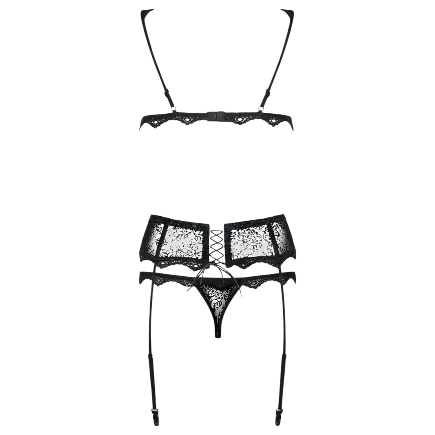 Ett lyxigt tre-delat underklädesset i helt genomskinligt material prytt med små broderier - perfekt för dig som älskar en stilfull och sexig look!
